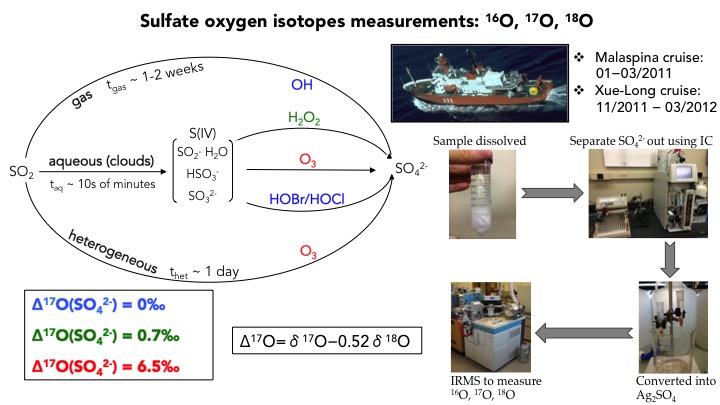 We collaborate with other groups to measure isotopic composition of sulfate aerosol and H2 with isotope-ratio mass spectrometry. A GRF proposal was recently funded to collaborate with UW to measure oxygen isotopes of sulfate in aerosol samples collected in the field.